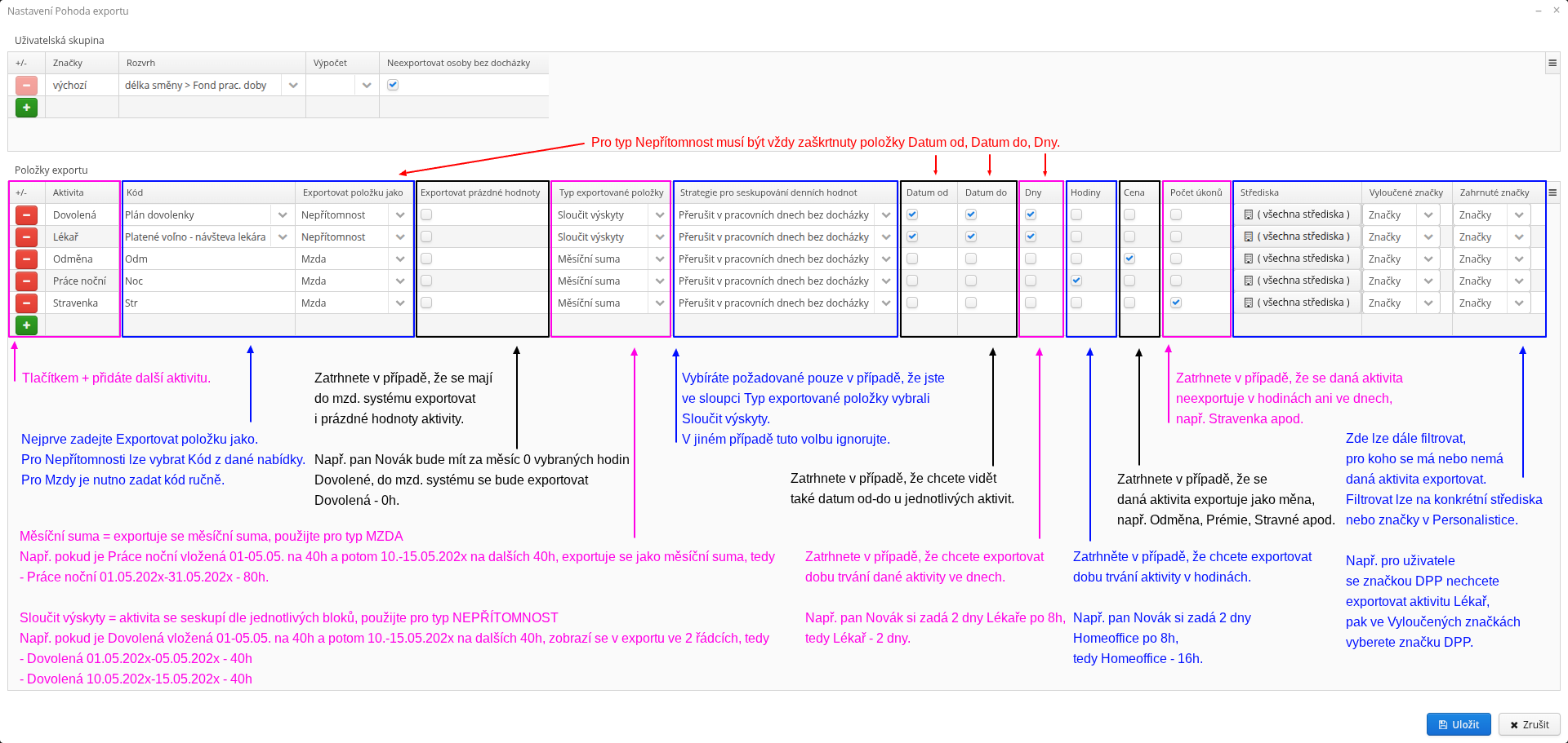 Pokiaľ si prajete z GIRITONu exportovať ďalšie dochádzkové aktivity, ktoré máte v mzdovom softvéri vytvorené, môžete si exportér sami nastaviť. V agende Dochádzka - Tlač - Export POHODA SK - Nastavenie exportu vyplňte do poľa Kód aktivity rovnaký kód, aký je použitý v POHODA SK, nastavte potrebné atribúty a uložte zmeny.
